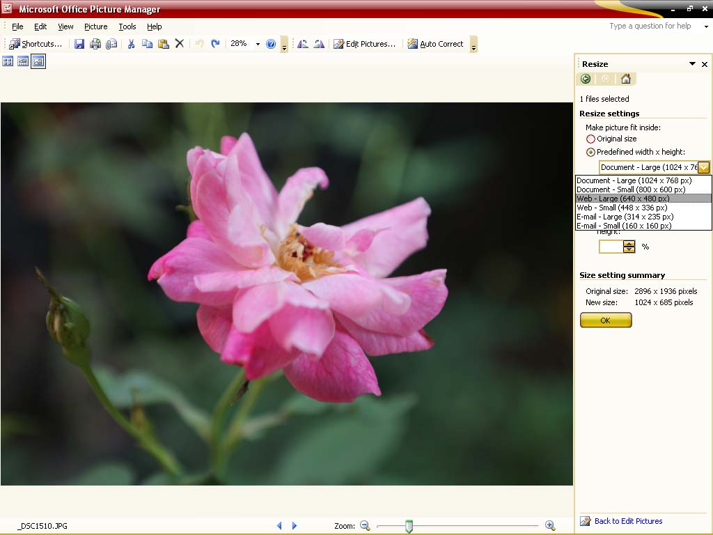Ada banyak software yang dapat melakukan resizing dan compress, misalnya adobe Photoshop, Corel Photopaint, GIMP, dll. Setiap kamera biasanya juga dilengkapi dengan CD untuk olah digital sederhana yang dapat melakukan fungsi resize dan kompresi. Namun jika Anda terbiasa menggunakan Microsoft Office, sebetulnya telah tersedia aplikasi dalam paket yang mungkin selama ini jarang Anda manfaatkan, yaitu Microsoft Office Picture Manager. Aplikasi ini dapat melakukan fungsi-fungsi dasar editing gambar, misalnya cropping, rotate, resize, mengatur saturasi warna, brightness, dan kontras. MS Picture Manager pada Office 2007 yang saya pakai juga bisa melakukan koreksi warna (color correction) dan mengurangi efek mata merah (red-eye reduction)